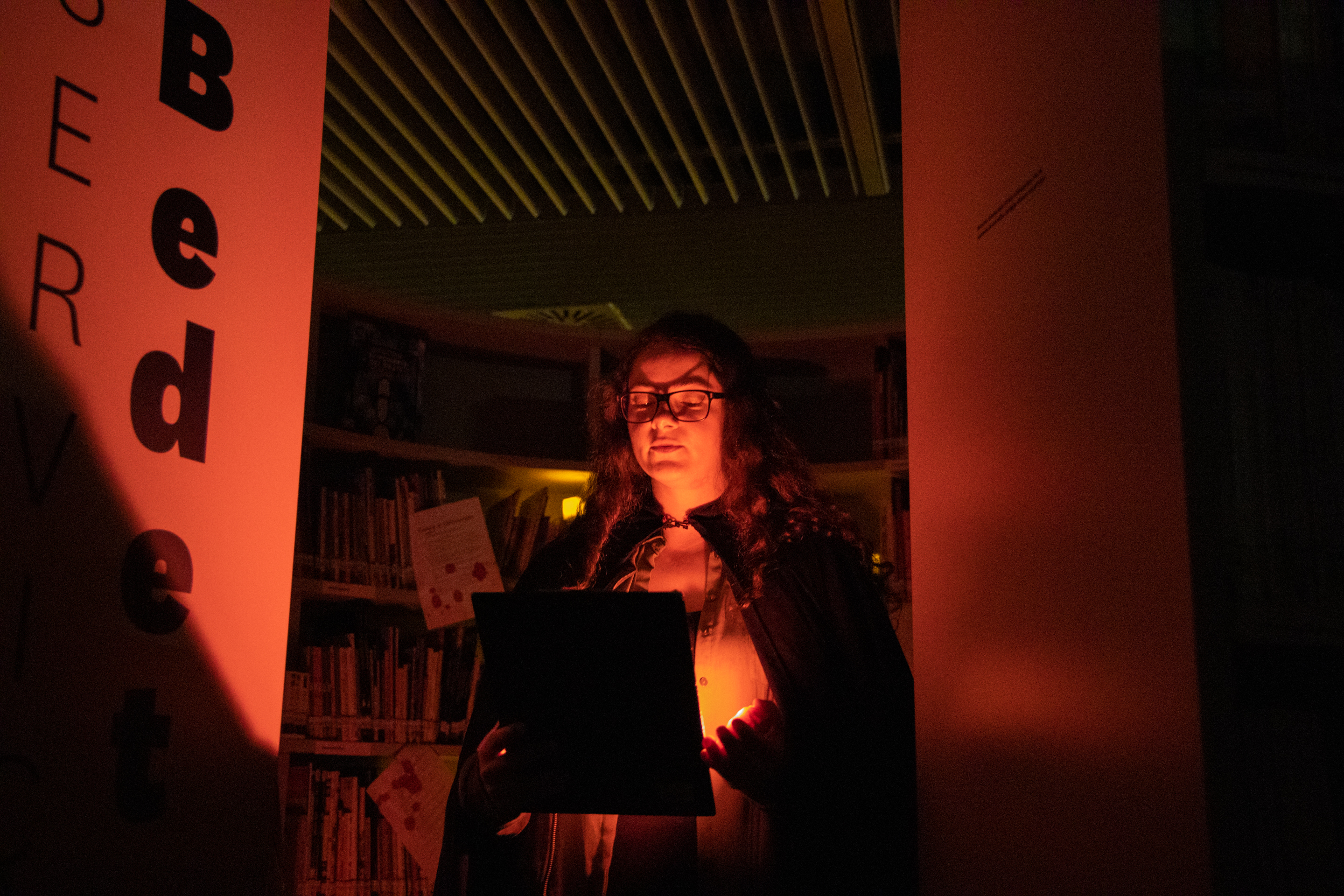 Contos de terror em ambiente imersivo ao longo dos vários espaços da biblioteca no âmbito dos Serões nas Bibliotecas de Lisboa 2022.